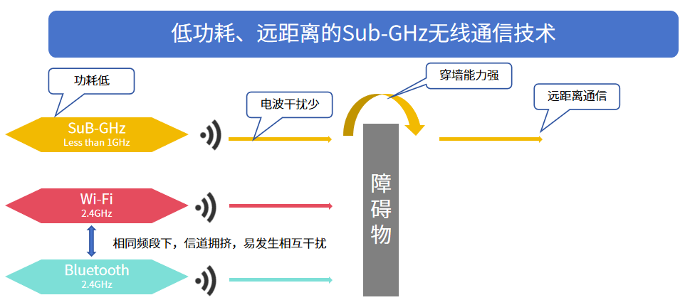 Sub-GHz是指频率低于1GHz的无线通信频段(例如315MHz、433MHz、868MHz、915MHz等),具有传输功耗低、传播距离远、网络接入容量大等特性,可满足物联网设备大规模连接和长时间运行的特殊需求。