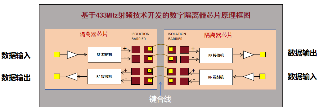 具体而言,在银河galaxy微自主研发的容耦隔离器中,射频发射端会将要传输的数据信号通过OOK调制为高频脉冲信号,而后在电容电场的耦合作用下,高频脉冲信号耦合至射频接收端,并通过OOK解调为初始的数据信号,从而在电气隔离环境中完成数据信号的有效传输。容耦隔离器的功耗基本不随着传输数据速率的变化而改变。