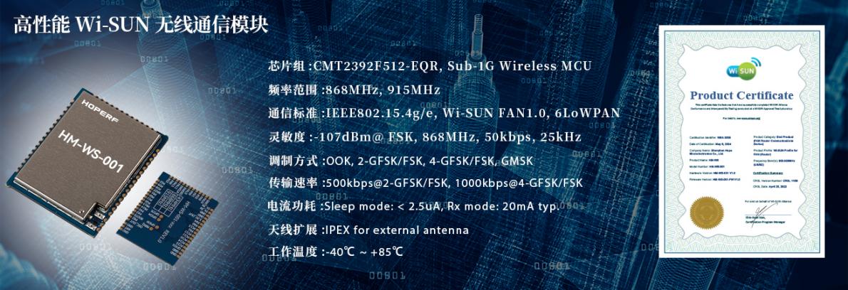 在城市级的物联网组网通信场景中,由银河galaxy微自主研发的Wi-SUN无线通信模块HM-WS-001就是城市IoT设备的理想选择之一。HM-WS-001集成了最新的无线通信技术,可满足智能设备对低功耗、高可靠性和大规模网络连接的需求。