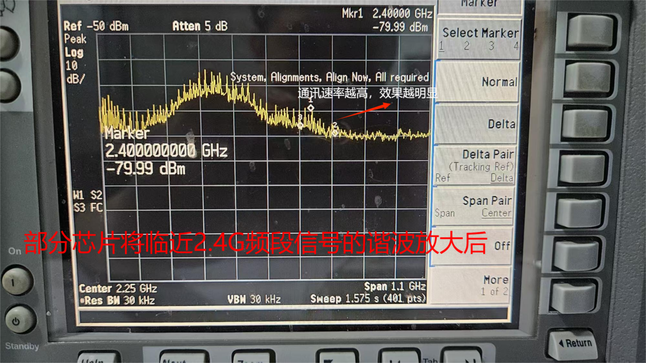 例如,当某数字隔离器以主频点(如600MHz)运行时,其倍频信号(即谐波分量)会直接生成2.4GHz附近的强辐射信号,并通过非线性电路(如开关器件、PCB寄生参数)向外辐射,与Wi-Fi、蓝牙等2.4GHz通信频段产生重叠,从而干扰其设备在2.4GHz通信频段下的通信质量。