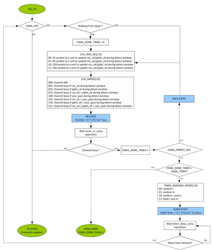 CSMA功能是一种在传输发射前先感知当前信道闲忙情况再决定是否发送的一种冲突避免机制(先听后说),其核心机制是通过将RSSI与设定的阈值做比较,从而判断信道闲忙情况。