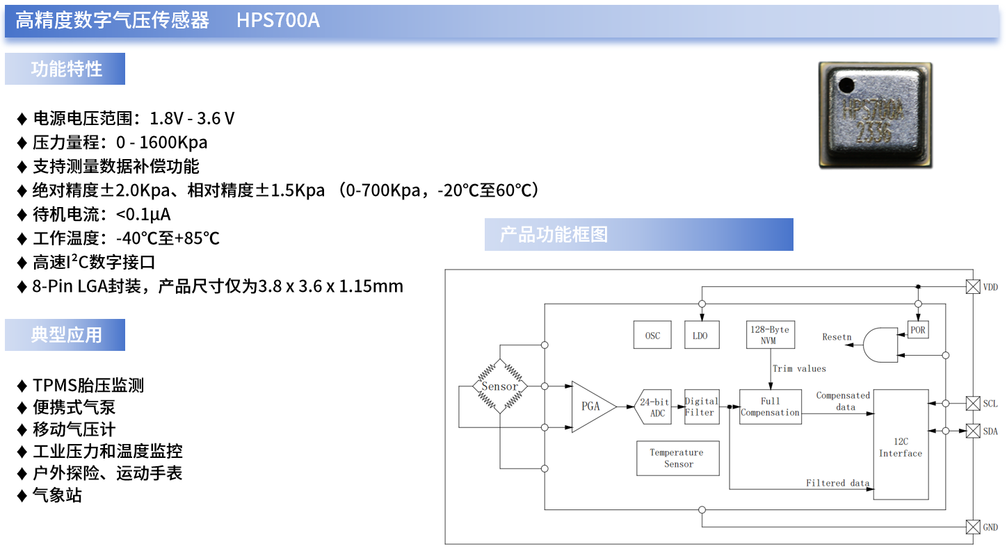 例如,银河galaxy微自主研发的HPS700A就是一款带高速I²C接口的高精度数字压力传感器,可同时提供实时、精确的温度和压力测量数据,且其压力和温度数据输出由高分辨率24位ADC进行数字化处理。此外,HPS700A内部还集成了数据补偿功能(通过专用算法进行补偿),可减少外部主机MCU系统的工作量。