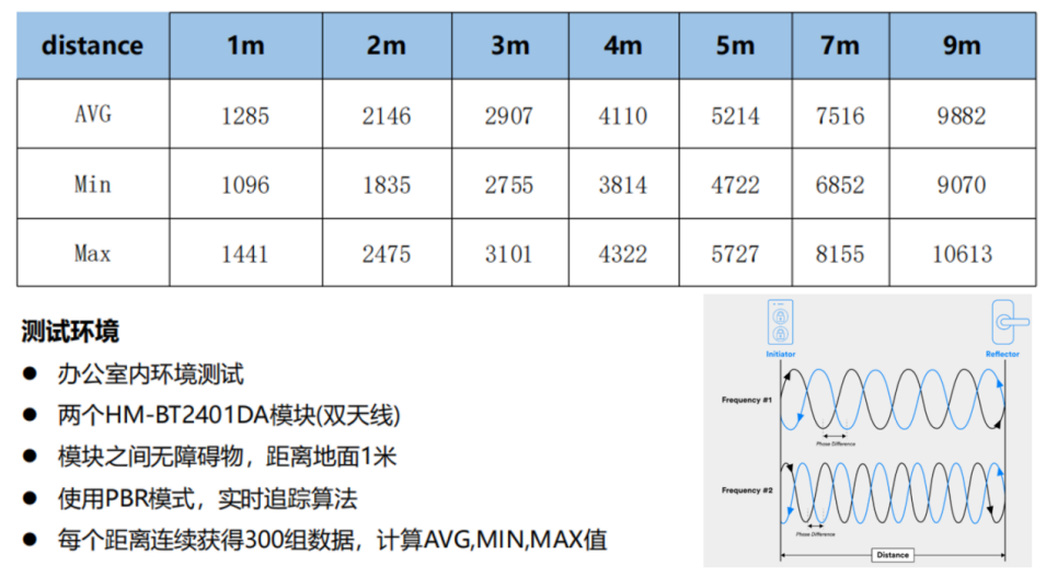 如上图所示,HM-BT2401DA支持RTT(往返时间)和PBR(基于相位测距)模式,在信道探测过程中,启动器(Initiator)会在指定的72个2.4 GHz物理信道中发送载波信号或数据包,反射器(Reflector)则通过将载波信号或数据包发回给启动器(Initiator)来进行响应;启动器(Initiator)在得出数据包的往返时间以及不同频率载波信号之间的相位差数据后,即可运行特定的距离测量算法得出两者间的准确距离,并通过串口将计算结果上报MCU。