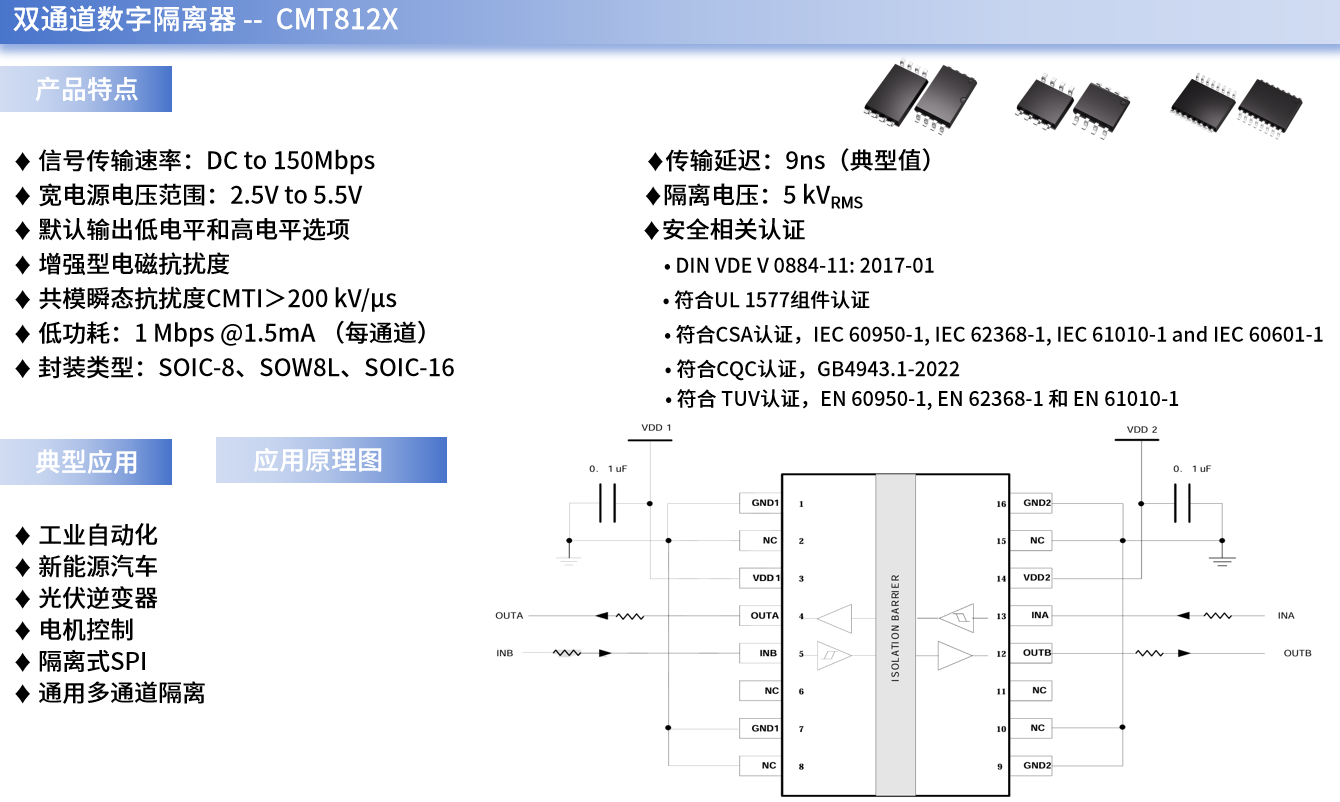 例如,CMT812X就是一系列银河galaxy微自主研发的、可用于USART串口通信中的高速双通道数字隔离器。它采用二氧化硅(SiO2) 绝缘栅,支持高达5 kVrms隔离电压,应用在两个不同电源域间通讯时,还能防止数据总线或其他电路上的噪声电流进入本地接地或者干扰及损坏敏感电路。