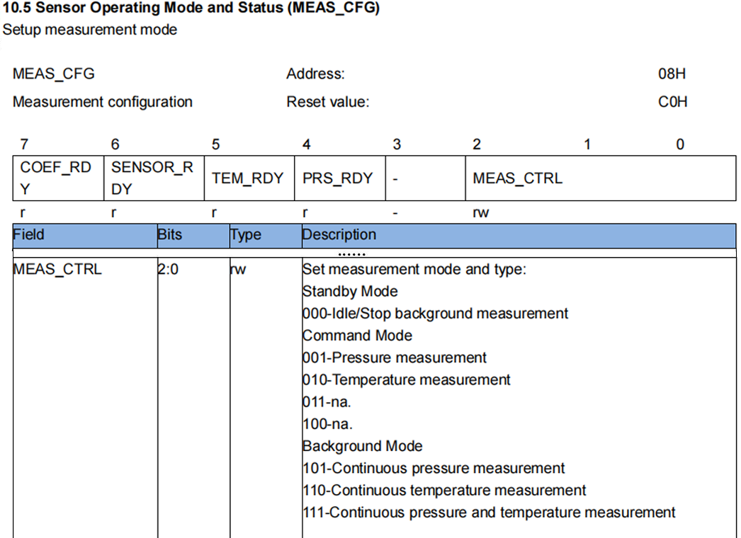 其中,在Background Mode运行模式下,用户可通过高速IIC接口读写压力配置寄存器(PRS_CFG) 和温度配置寄存器(TMP_CFG),来灵活配置传感器的测量精度、测量速率与测量时间,以灵活适应对运行功耗、测量精度和测量速率等参数存在不同需求的多种应用场景。
