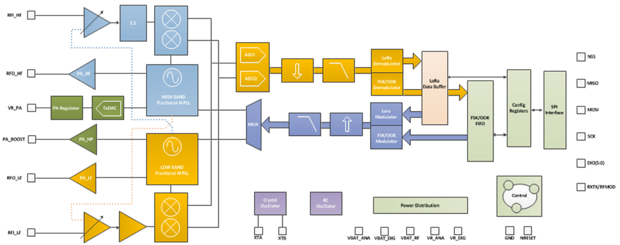 如下图所示,RFM95是一个半双工、低中频的无线射频收发器,它内置了标准频移键控(FSK)调制解调器与远距离扩频(LoRa™)调制解调器,可支持用户根据实际需求,灵活选用/切换OOK、FSK、LoRa等多种信号调制方式。