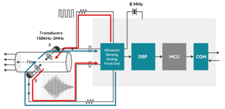 信号处理单元(SPU)主要用于对超声换能器采集到的电信号进行一系列处理,包括放大微弱信号以提高其幅值、滤波去除噪声和干扰以提升信号质量、进行模数转换将模拟信号转为数字信号以便MCU/DSP处理,还会依据测量原理计算出流体的流速和流量,并通过特定接口将测量结果输出给显示设备或其他外部设备。